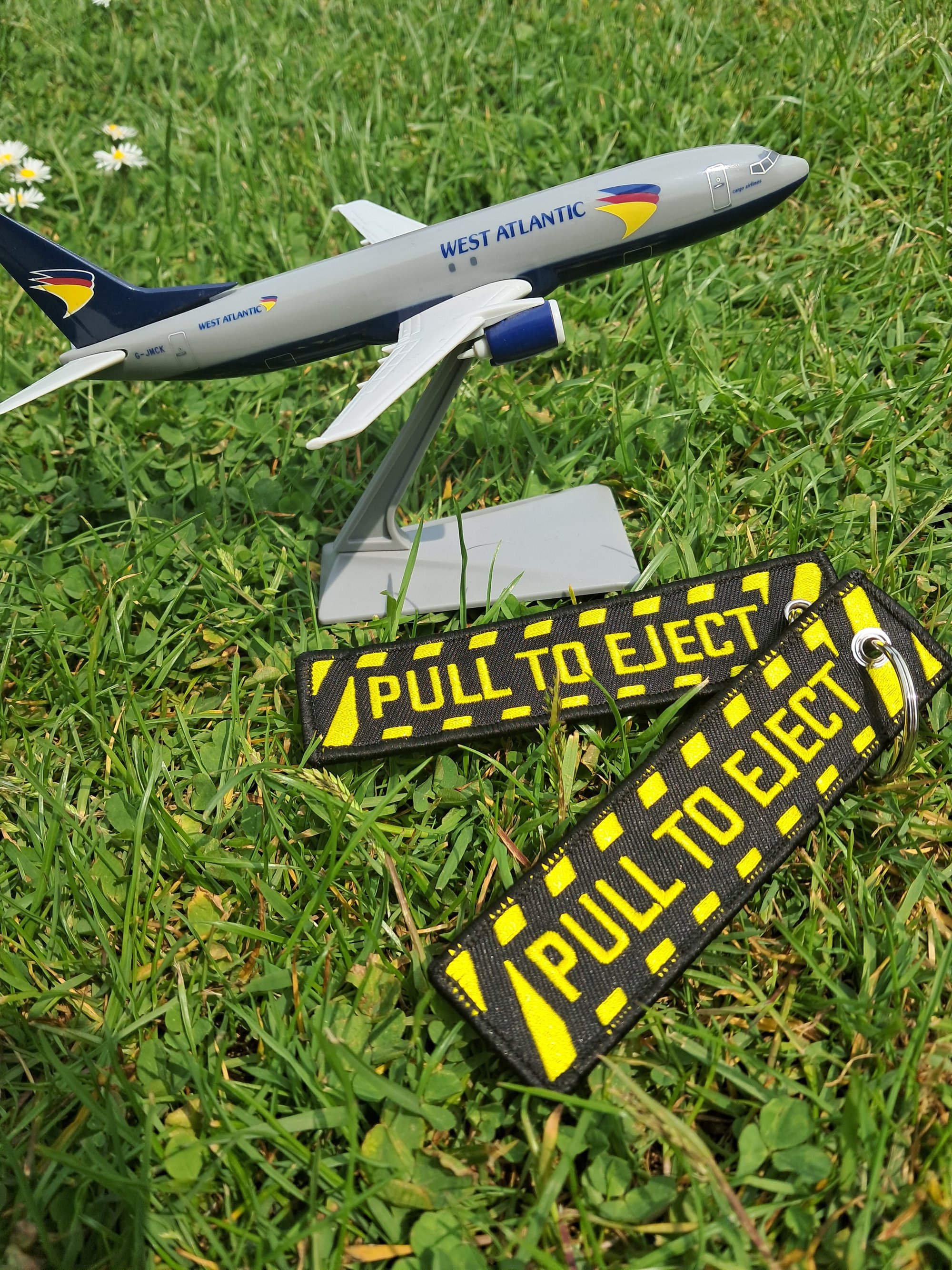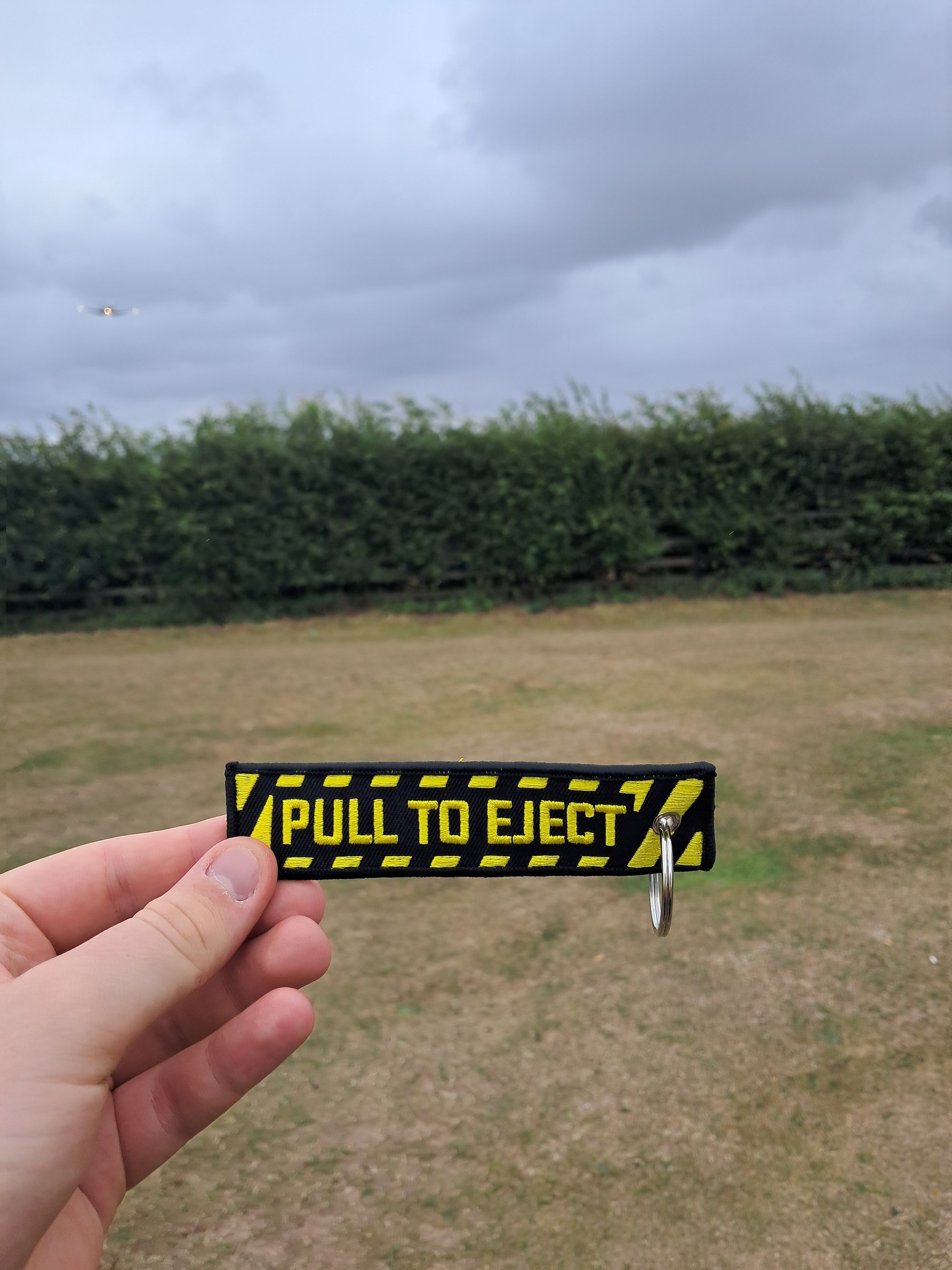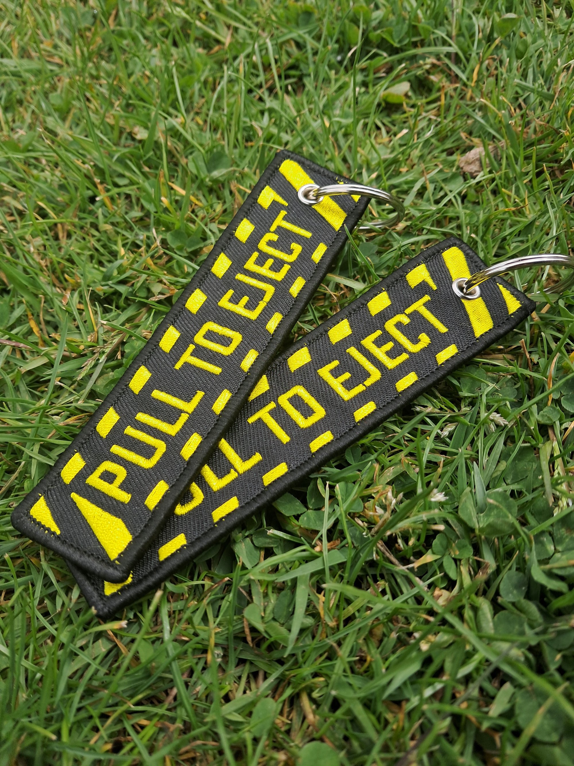 Take to the skies with your own Pilotlocker Aviation Tag! Inspired by real military ejection seat warning labels, this bold embroidered key tag is a must-have for any military aviation fan. Featuring high-visibility yellow stitching on durable black fabric, it gives an authentic, tactical feel while keeping your keys or gear easy to find. Finished with a rugged metal split-ring and proudly produced by Pilotlocker.